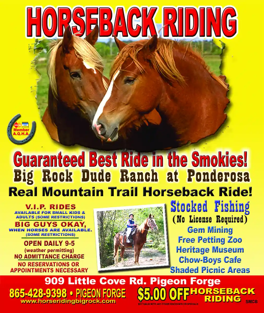 Nestled in the Great Smoky Mountains, we are the only horseback riding stables in the area offering an authentic mountain trail ride. Our trails are maintained daily to ensure your safety. Our farm boasts a spotless environment. Our horses are washed daily, and their health is our number one commitment. There is no admission charge. We have a free petting zoo – with ponies, llamas, alpacas, goats, emus, peacocks, and an assortment of many other animals. We also have a free picnic area with horseshoe pits and a playground for small children. Enjoy the beautiful, peaceful stream that winds through the property alongside a fully stocked fishing pond. Visitors of all ages can find something to enjoy. Like gem mining, which harbors amethyst, pyrite, citrine, and turquoise. Our fishing pond is stocked with bass, blue-gill, crappie. and catfish. There is no license required. We supply the bait and the fishing pole, and the pass is good for 3 days.