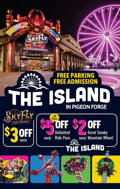 The Island is showcased by a 200-foot Observation Wheel and the Island Show Fountains, which are programmed to perform to light and music year-round. Our oasis in the Smokies is open 365 days a year with free parking and free admission, making it accessible for anyone visiting Pigeon Forge, Tennessee.