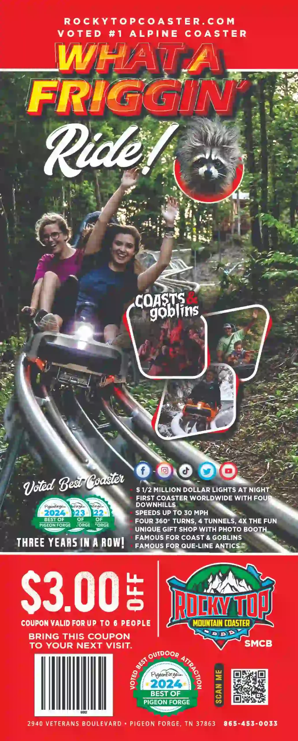 Not just another mountain coaster; an entire family experience! Sitting on over 20 acres of beautiful Smoky Mountain scenery, our coaster features plenty of tunnels, curves, and 360 degree turns. Reaching speeds of up to 30 mph, this attraction is projected to set records as the longest coaster in East Tennessee. You’ll want to come visit us after nightfall where are magnificent lights will guide you thru a thrill packed excursion: an experience that will stay with you long after the ride is over! Rocky Top Mountain Coaster is something both the young and senior in age can enjoy. We are located across from Dollywood on Veterans Boulevard.