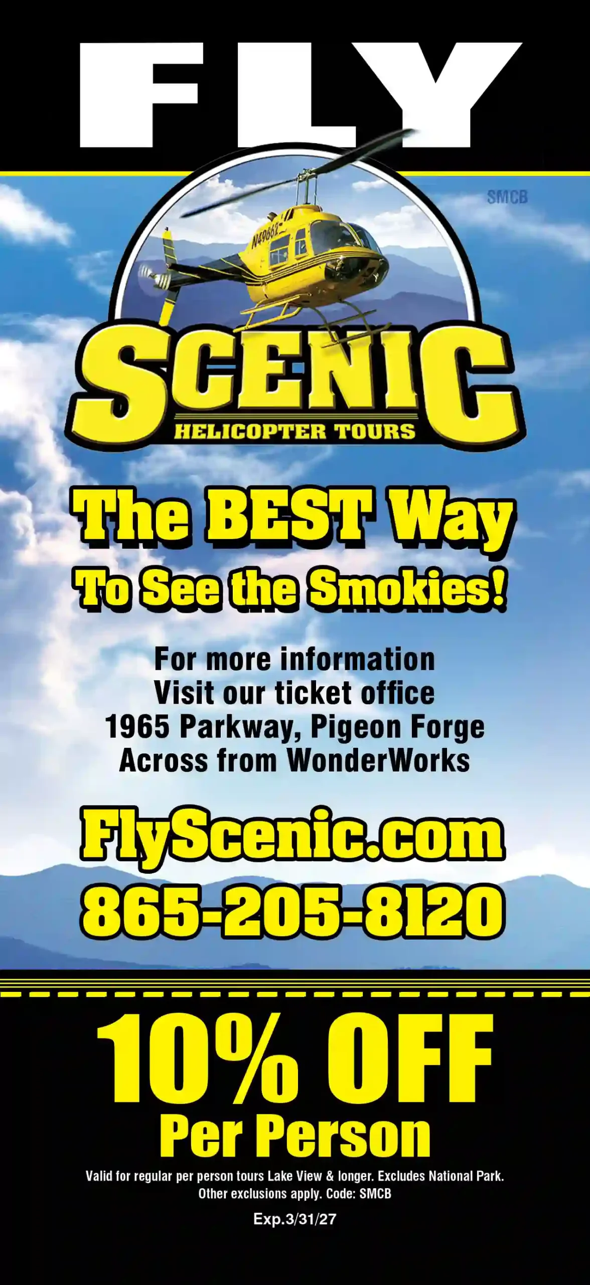 Join us for high flying fun in the Smoky Mountains! Scenic Helicopter Tours offers amazing aerial tours of the Smoky Mountains and surrounding areas, such as Douglas Lake, the French Broad River, Bluff Mountain, and more! Ticket prices start at just $29!
