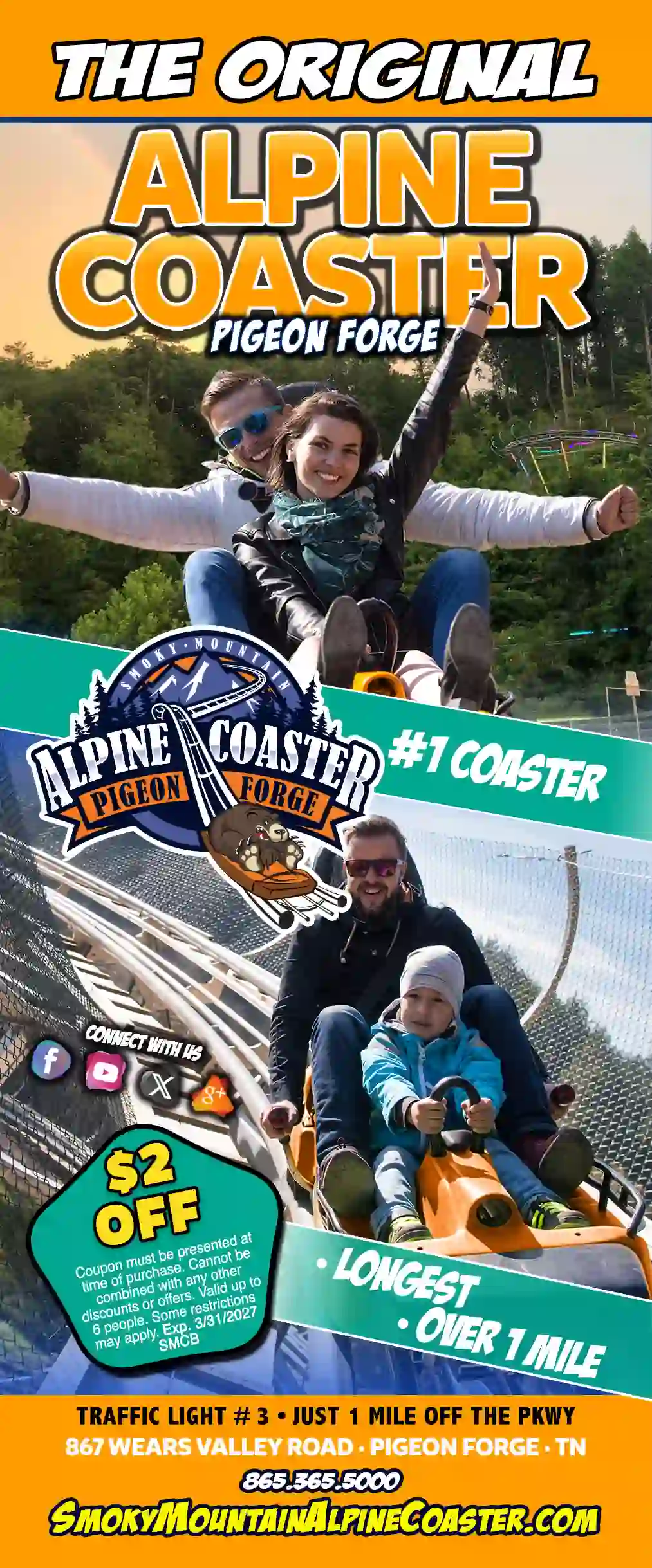 The Smoky Mountain Alpine Coaster is the longest downhill ride in the United States,with over 1 mile of track, so if you are looking for an unforgettable experience in your vacation here in the Great Smoky mountains, this is a must do!